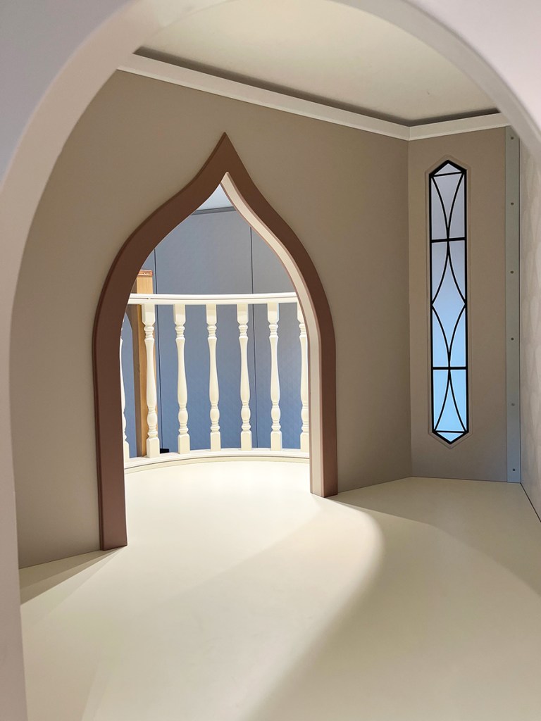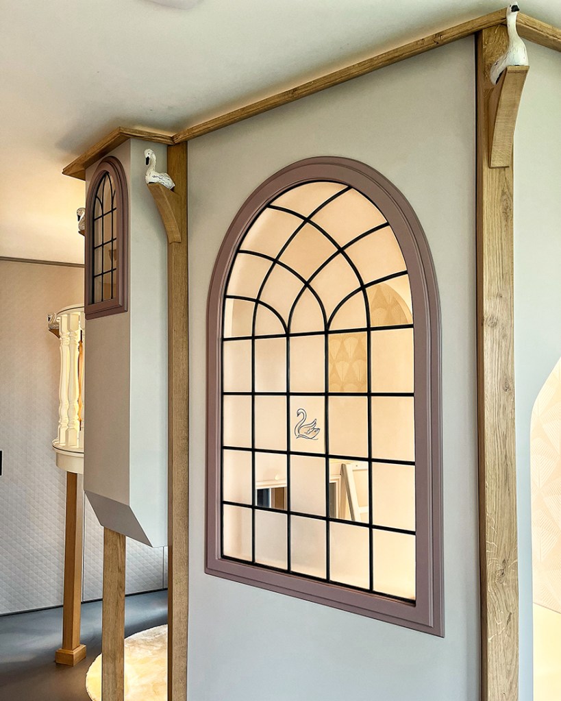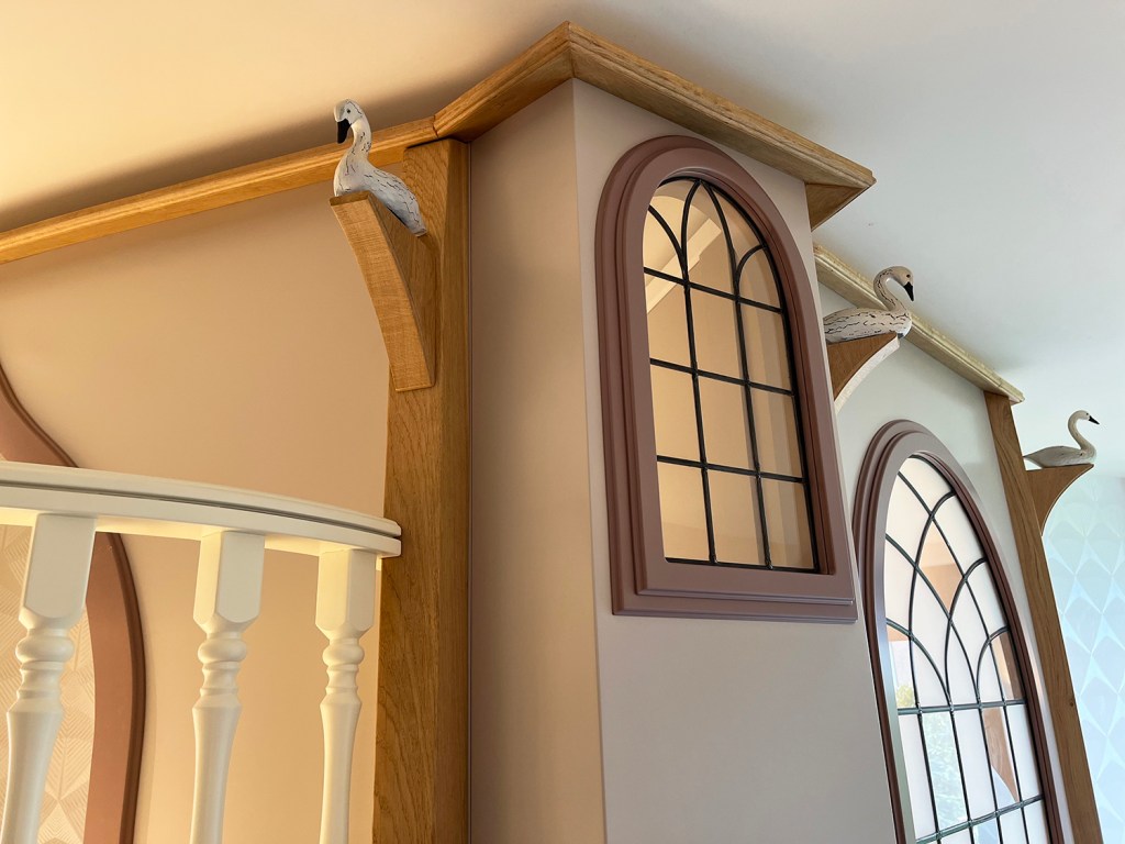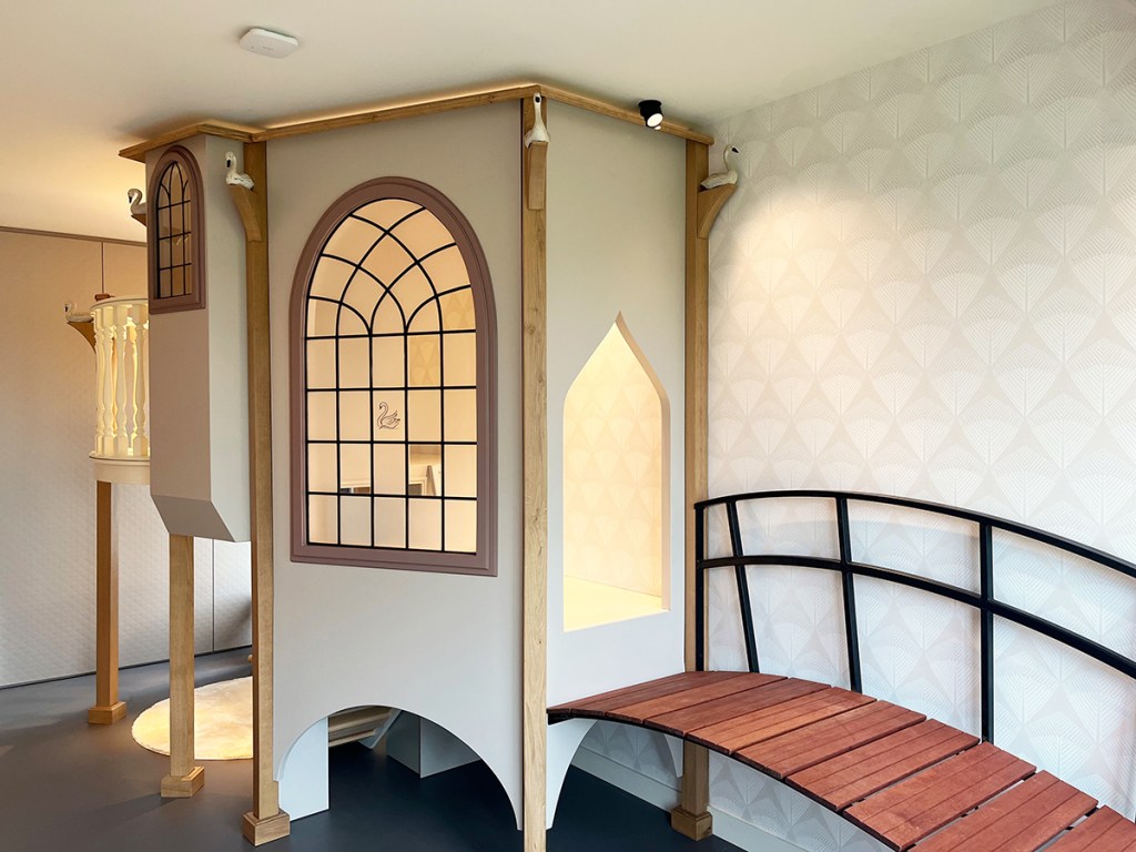 Een fantastisch sprookjeskasteel met ‘echte’ glas in lood ramen en handgesneden zwanen uit hout.