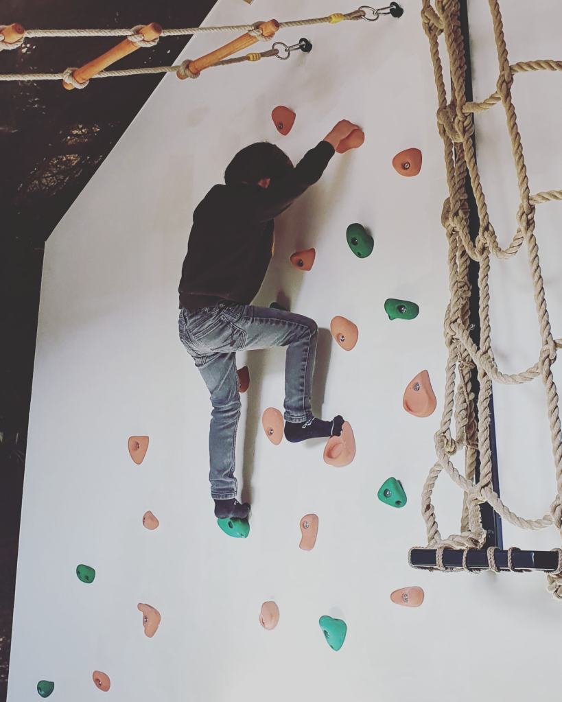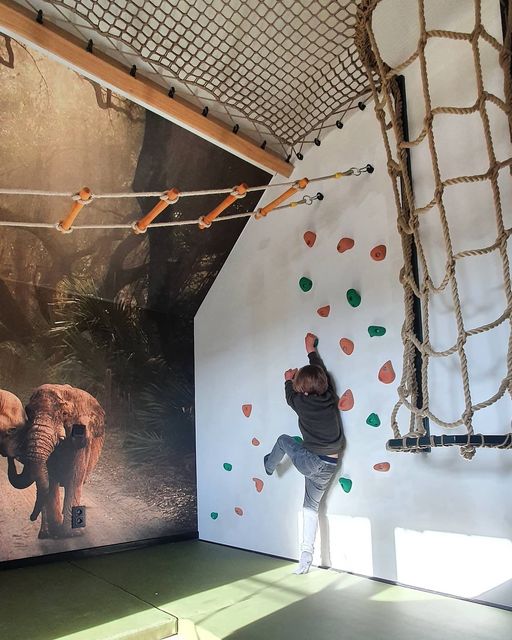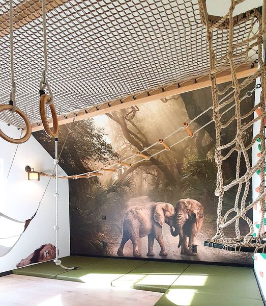 Deze kamer is uitgevoerd met diverse speelelementen die elkaar versterken. Zo kun je via het klimtouw naar de touwladder om vervolgens via de klimwand weer naar beneden te klauteren.