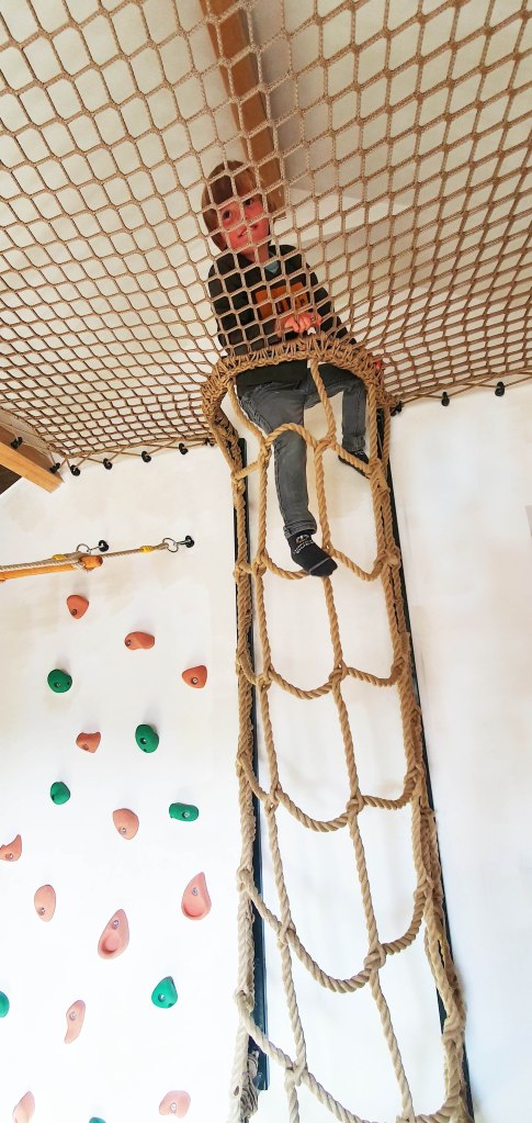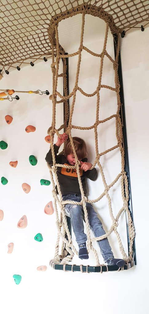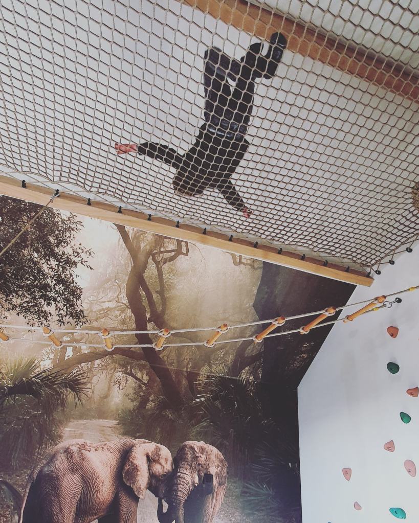 Om de ruimte optimaal te benutten hebben we helemaal bovenin de kamer een groot net gespannen. Een op maat gemaakte klimtunnel biedt toegang tot deze mega hangmat.