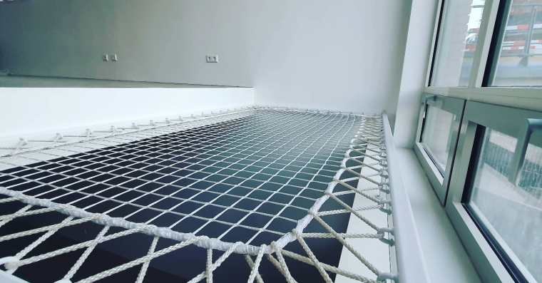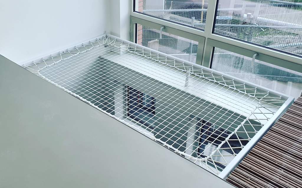 Voor deze ruimte lieten we speciaal een frame lassen waar we het net in monteerden. Zo is het behalve een stevige constructie ook een strak en stijlvol design.We houden het net altijd iets kleiner zodat er na verloop van tijd, als er voldoende op gespeeld is waardoor de rek er uit gaat, het nog gemakkelijk na kunnen spannen.