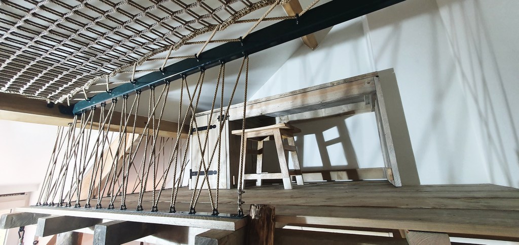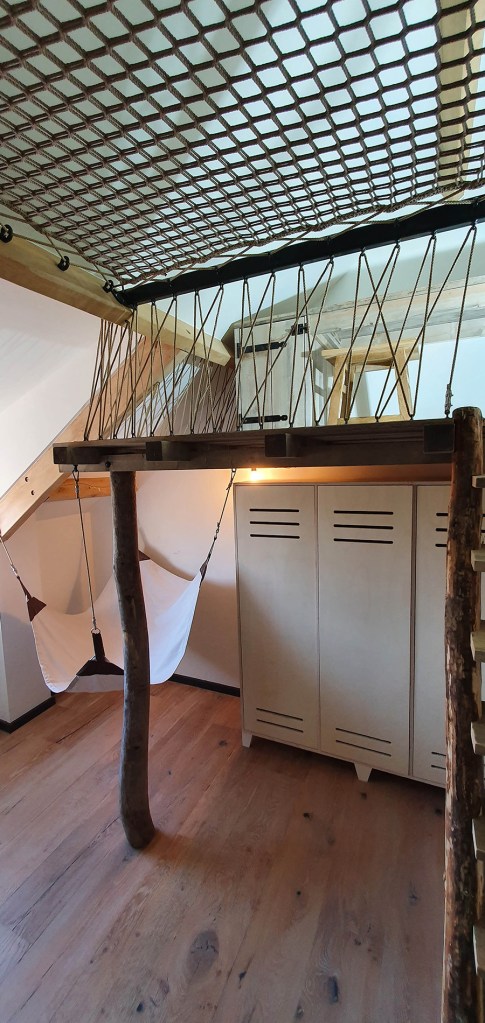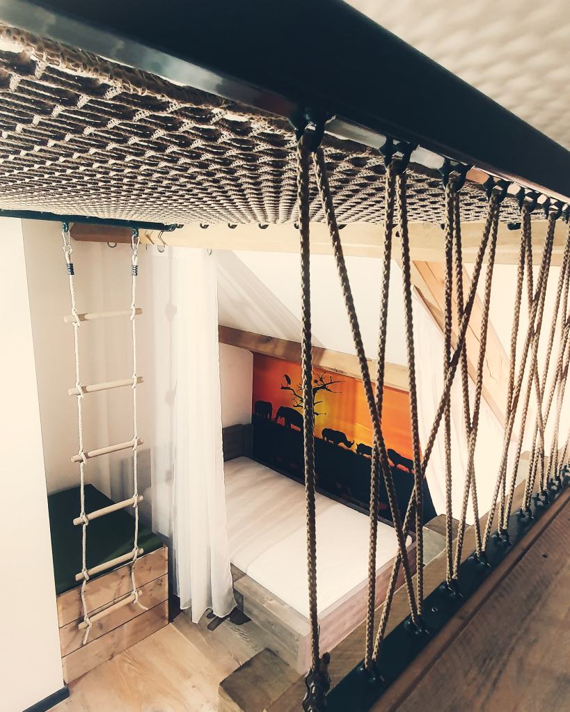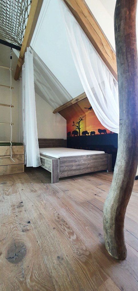 Met echte stammen en ruig hout krijgt deze kamer de juiste ‘savanne’ uitstraling. Een klamboe bij het bed zorgt ervoor dat je je lekker terug kan trekken in je eigen ‘lodge’.