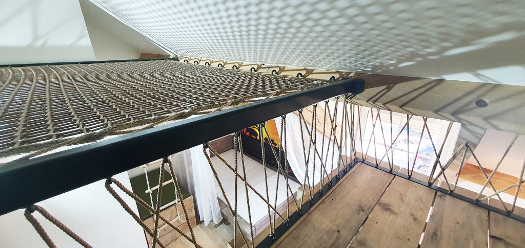 Een grote hangstoel en handige bijpassende kledingkast maken dit interieur compleet.